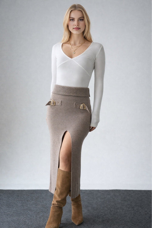 Kadın Aksesuar Detaylı Yırtmaçlı Triko Etek