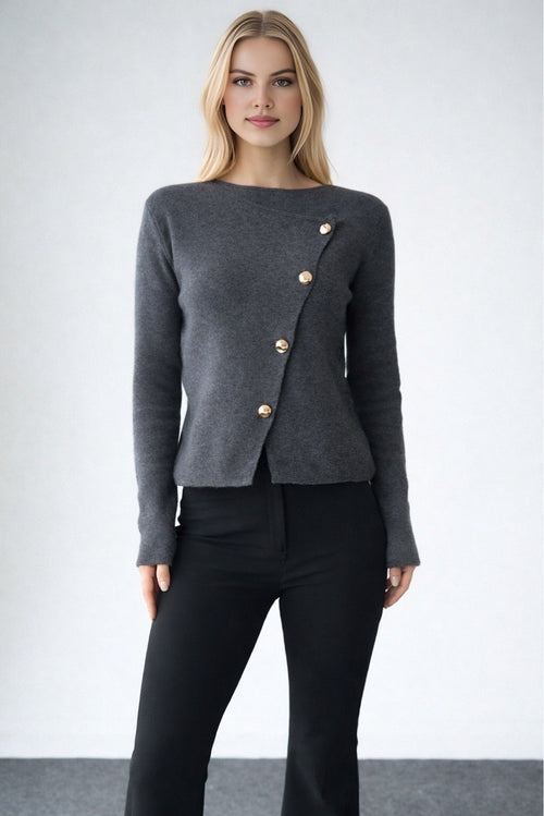 Kadın Gri Polo Yaka Düğmeli Baklava Desenli Atlılı Kazak